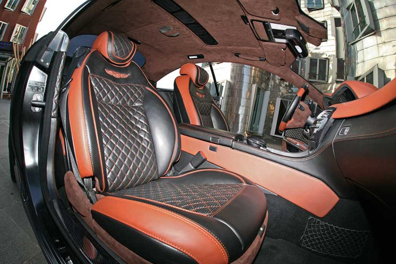 Салон автомобиля был изменен в соответствующей внешнему виду манере: сиденья перетянуты в новую коричневую кожу с рисунком в ромбик и прошиты двойным швом. Зеркала в салоне, спортивный руль, средняя консоль, пороги, накладки на двери, накладки на осветительные приборы – всё это сделано из карбона. В салон установлена Hi-Fi аудиосистема, а потолок и сиденья выполнены в сочетании карбона, темно-коричневой кожи, и темно-коричневой алькантары. Конечно, в соответствии с пожеланиями клиента, можно выбрать и любую другую цветовую гамму.