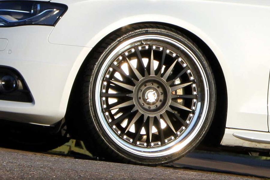 Для начала мастера усовершенствовали активную оригинальную подвеску седана, оснастив ее комплектом регулируемых по высоте спортивных пружин. Теперь владельцам предлагается более широкая возможность варьирования высоты шасси, чем в оригинале. Напомним, что там было только два положения шасси: обычное/спорт, при этом свойства активной подвески Audi полностью сохраняются. Контакт с дорогой обеспечивают трехсоставные колесные диски 9х20” и покрышки Hankook Ventus S1 Evo размером 255/30/20. Чтобы всё это должным образом привести в движение, был сделан чип-тюнинг мотора: к оригинальным 333 лошадкам мастерам удалось добавить еще 97 л.с., а чтобы не только почувствовать, но услышать мощность «зверя» оригинальную заднюю часть глушителя заменили на спортивную, стальную. В модели, представленной на фотографиях, установлен черный матовый вариант глушителя, внешне схожий с трубами моделей S4 и S6. Для создания строгой черно-белой тональности спортивного лимузина решетка радиатора, корпуса зеркал заднего вида и задний диффузор были покрыты черным матовым лаком. По желанию все названные выше элементы и некоторые элементы салона – декоративные планки, компоненты спортивного руля и среднюю консоль можно заменить на карбоновые. Спортивный руль украшается разнообразными кожаными вставками.