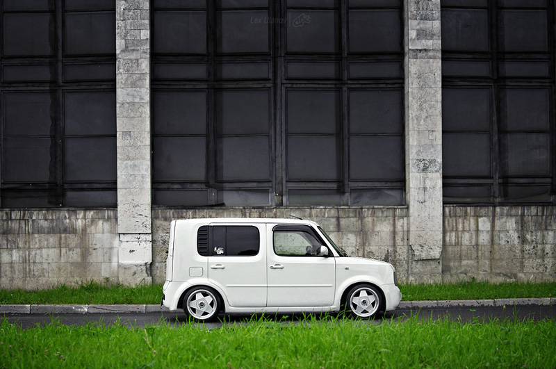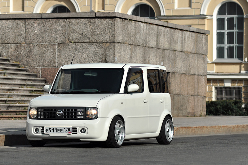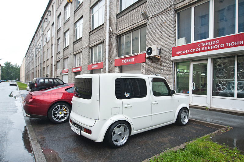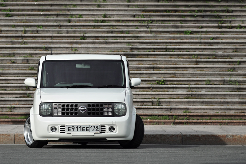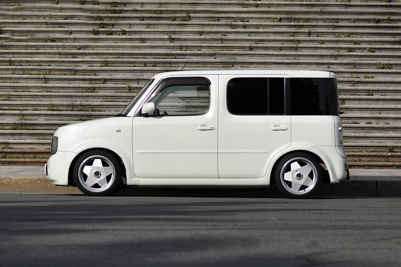 На автомобиль Nissan Cube z11 были установлены диски Borbet Design A 7.5x16" ET20 c резиной 165/50 R16 Nankang AS-1. Классические немецкие широкие диски в комплекте с узкой резиной отлично вписались в необычный дизайн японского автомобиля. А за счет установки заниженной подвески автомобиль стал выглядеть еще более гармонично и притягивать еще больше взглядов.