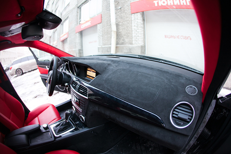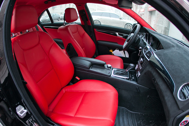 На новом рестайлинговом C-class'е был полностью перешит салон в кожу и алькантару красного и черного цветов. Изначально черный салон с пластмассовой торпедой было решено перешить в кожу ярко-красного цвета. Чтобы смотреть каждый день на этот салон и радоваться, долгой зимой, дождливым летом, невеселыми осенью и весной. Сиденья и потолок сделаны из красной кожи Hans Reinke и алькантары. Торпеда была перетянута в алькантару черного цвета. Также черная алькантара, как продолжение торпеды заходит на дверные обшивки, где отлично гармонирует с вставками из той-же красной кожи.