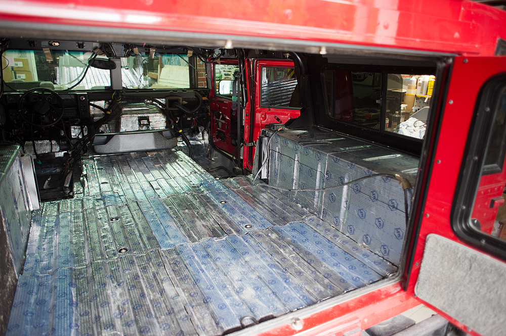 На красном Hummer H1 был полностью зашумоизолирован салон, багажник и потолок. Теперь передвигаться по трассе в машине стало заметно комфортнее.