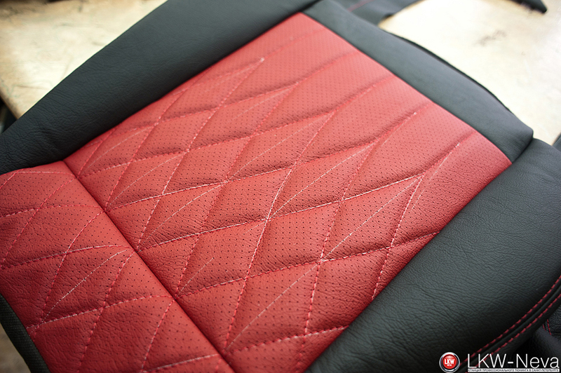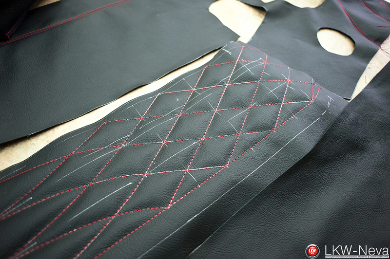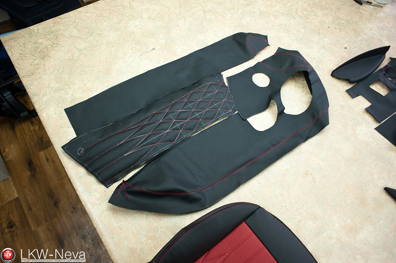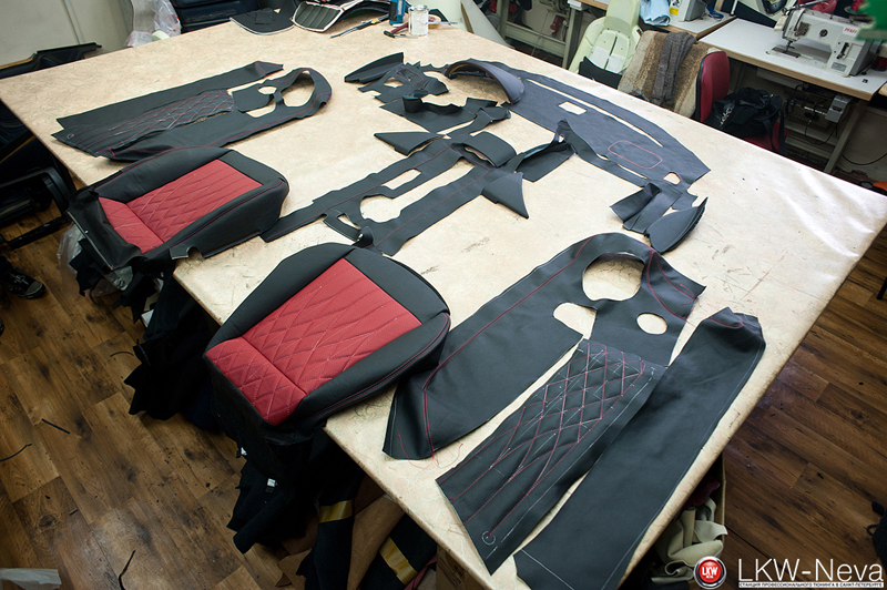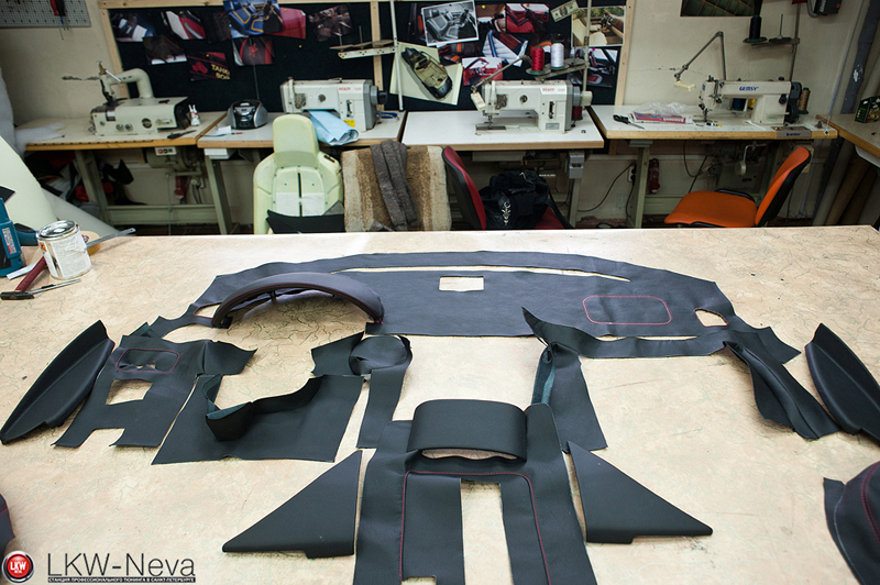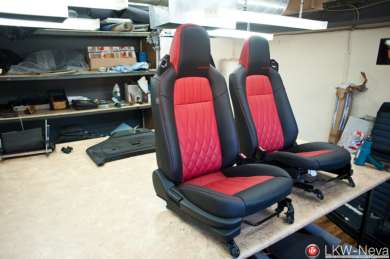 По заранее разработанному дизайн-проекту были перешиты сиденья, торпеда, двери целиком, центральная консоль, планка вокруг стекла. На сиденьях были сделаны вышивки.
