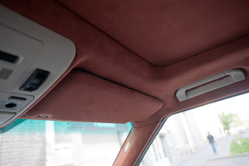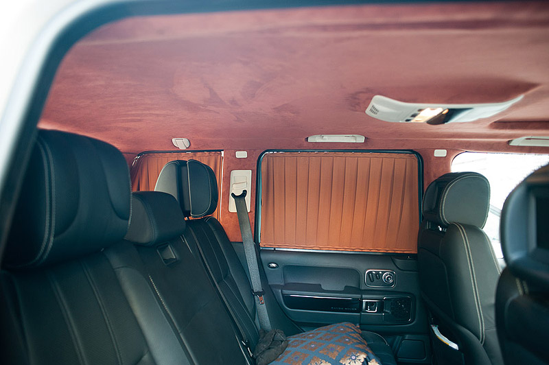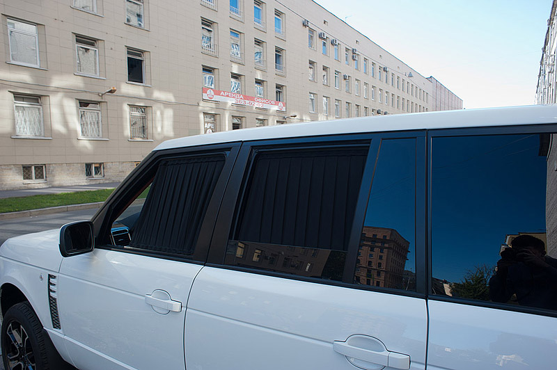 На автомобиле Range Rover westminster были проведены работы по перешиву потолка, козырьков и задней полки в алькантару, также были установлены шторы на передние и задние окна автомобиля. Шторы двуслойные - внутри, в тон интерьера - коричневые, снаружи - черные.
