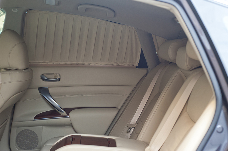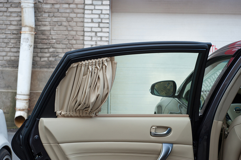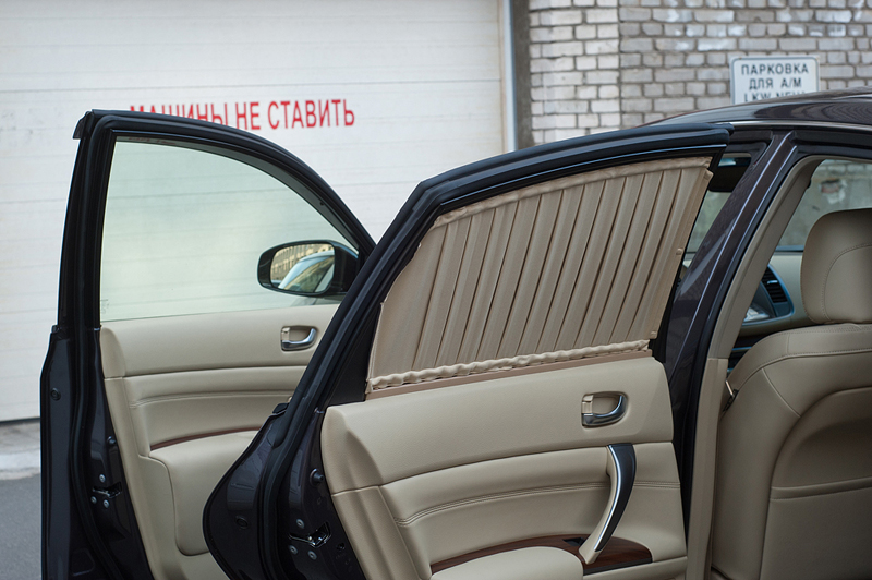 На новую Nissan Teana были установлены шторки на задние двери и заднее стекло. Шторки двухцветные - снаружи черные, изнутри бежевые, под цвет салона. Они крепятся на двух направляющих, что позволяет сдвигать из в случае необходимости.