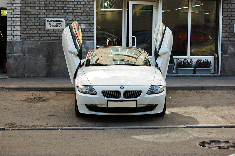 На белоснежную BMW Z4 был установлен новый комплект вертикального открытия дверей (можно сказать гильотинного типа), так называемые LSD двери (Lambo Style Doors). Теперь эта машина привлекает всеобщее внимание не только когда она едет, но и когда стоит с открытыми дверями.