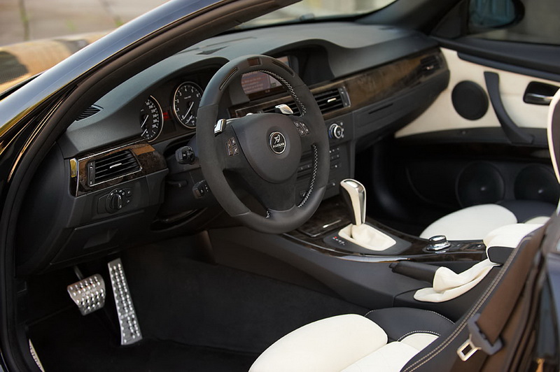 Интерьер: салон перетянут в черную кожу и бежевую алькантару, педали и площадка для отдыха Hamann