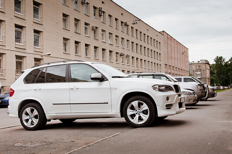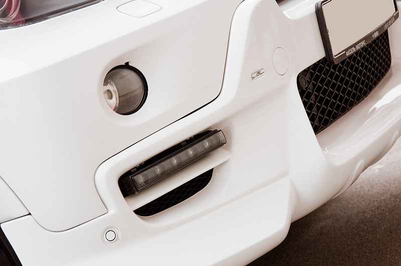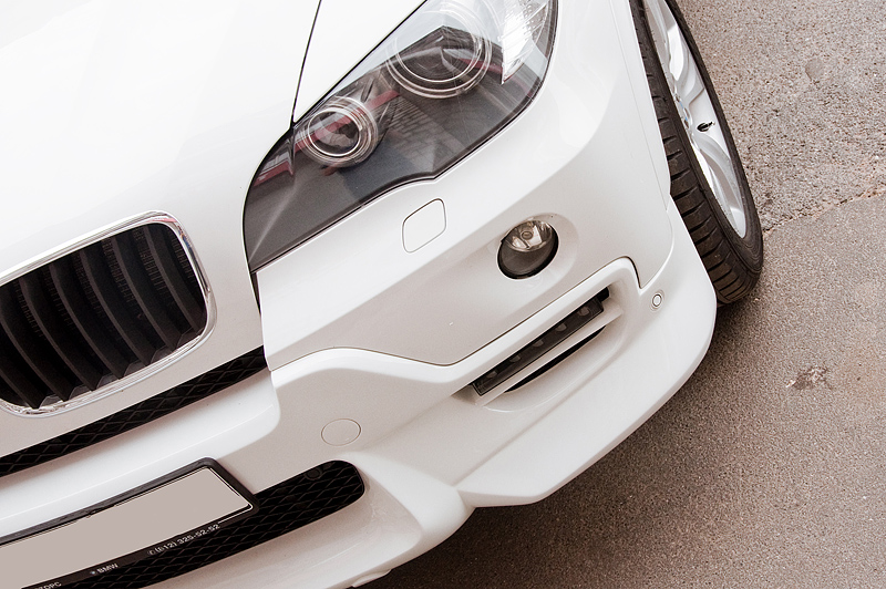 Такой аэрокит для X5 понравится всем – стильный, но отнюдь не переворачивающий наши представления о модели. Новая передняя юбка с объемным воздухозаборником и законцовками-спойлерами существенно приблизила к асфальту переднюю часть машины и заметно добавляющие узнаваемости и индивидуальности всему комплекту. Доволнительно в неё была установлена очень популярная сейчас LED-подсветка. В заднюю юбку интегрированы две сдвоенные насадки выхлопной системы из нержавеющей стали. Также в комплект входят новые пороги, стандартно они черного цвета, но в этот раз мы их покрасили в белый - так общий вид автомобиля стал намного гармоничнее.