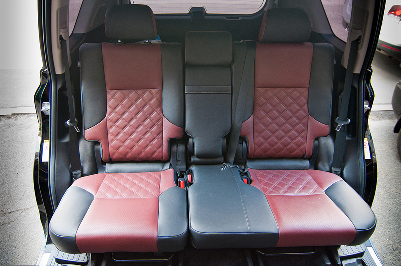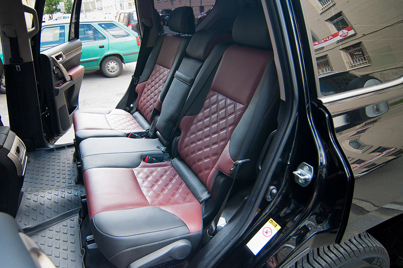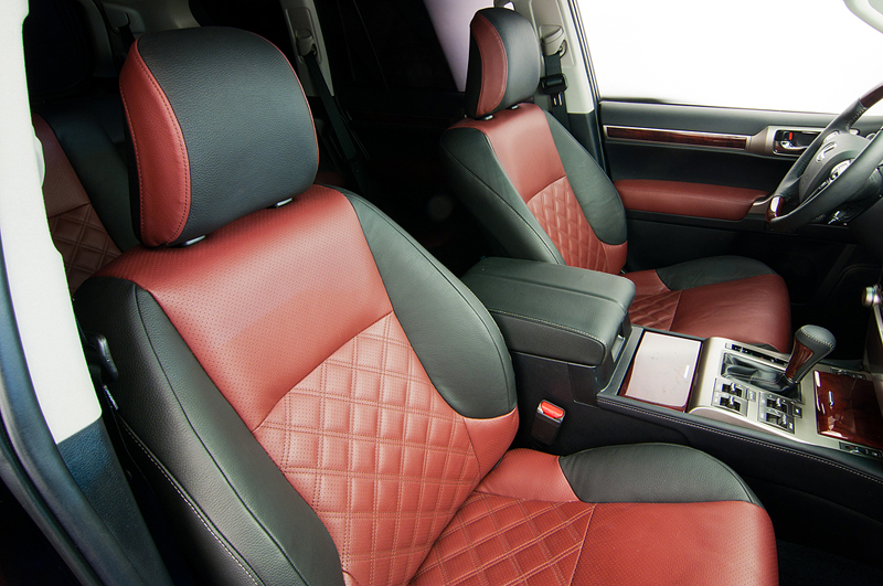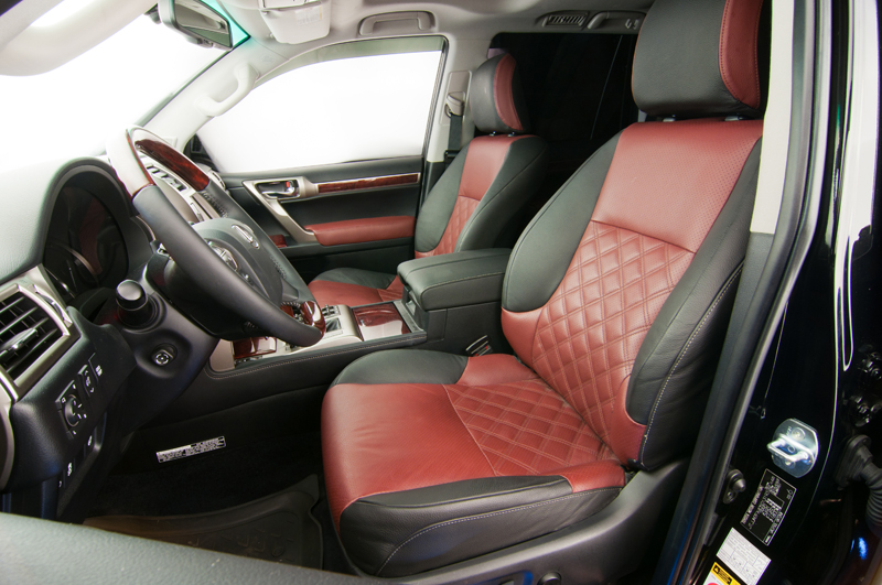 На небольшом джипе Lexus GX460 стандартный скучный черный салон был перешит в два цвета: черный с тёмно красным. На центральных вставках в сиденьях были вышиты ромбики, что добавило изысканности салону автомобиля. На вставках в дверях тоже появился красный цвет.