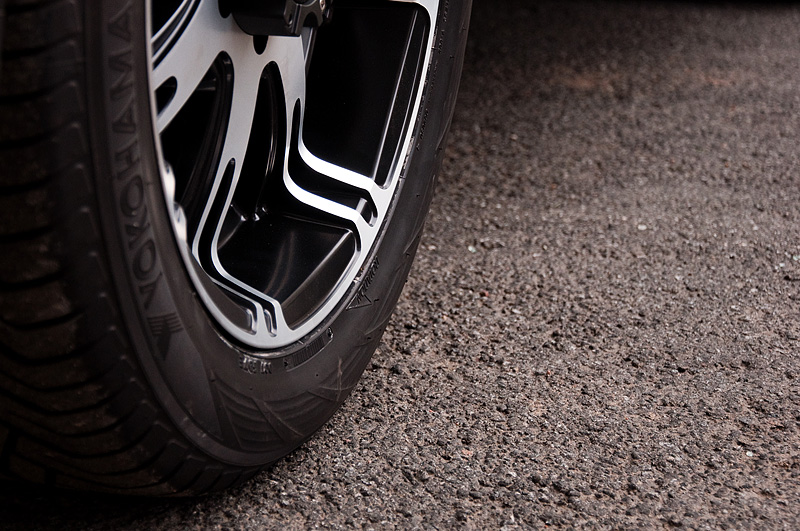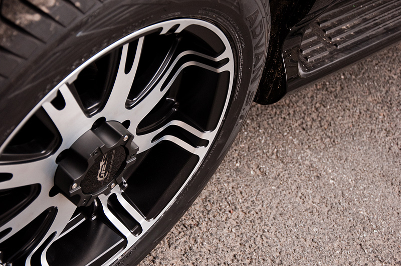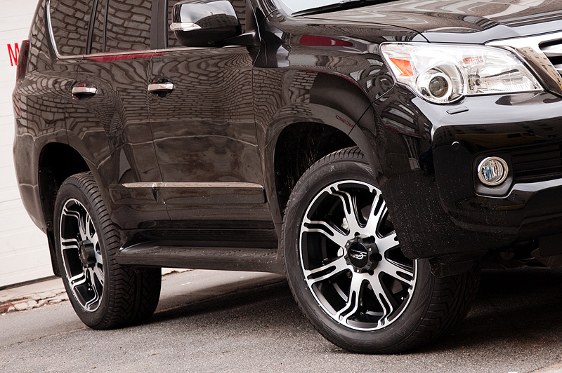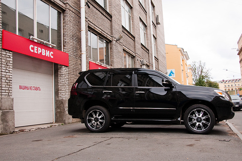 На новенький Lexus GX460 были установлены необычные колесные диски фирмы American Racing модель DEJ 708 черного цвета, диаметр - 20", ширина - 9". С одной стороны у них есть небольшая полка, а с другой, что является большой редкостью, общий рисунок спиц диска заходит на полку. Чтобы понять проще посмотреть на фотографии, представленные ниже. Спицы плавно находящие на полку ничуть не скрадывают её, а наоборот подчеркивают. Это хорошо помогает оптически отделить её.