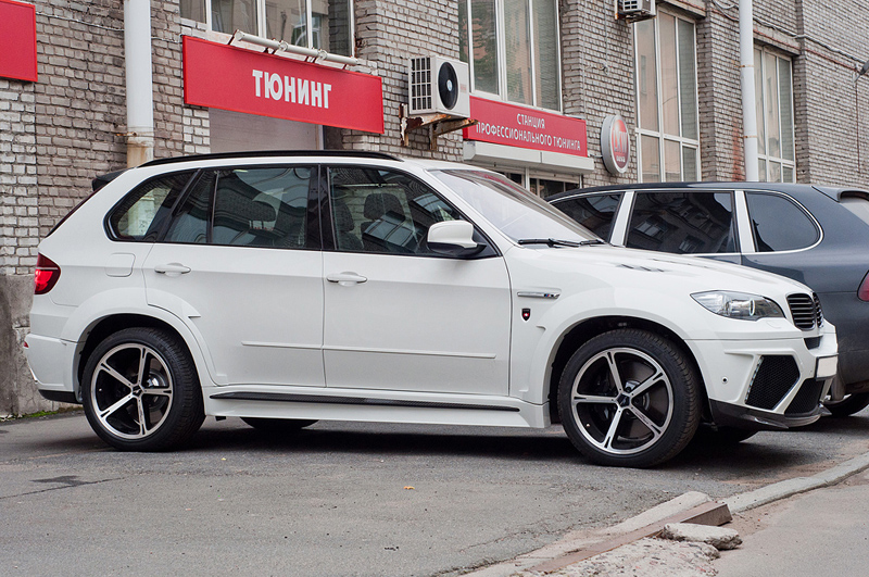 На новый BMW X5 M был установлен широкий обвес от известной на рынке тюнинга, швейцарской фирмы Mansory (http://www.mansory.com/). Обвес сразу и разительно выделил этот "икс" из потока одинаковых серых и черных BMW Х5 и Х6, которых не мало в нашем городе. Фирма Mansory давно специализируется на тюнинге автомобилей премиум-сегмента рынка. Мастера фирмы LKW-Neva покрасили и установили этот обвес быстро и качественно.