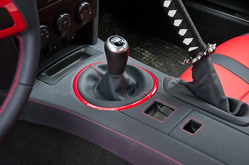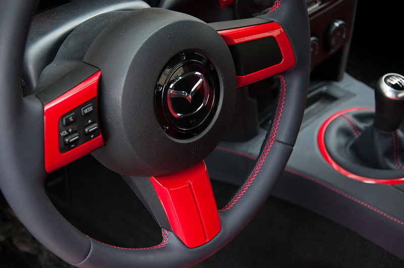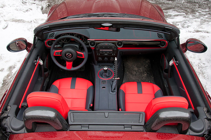 На Mazda MX-5 был полностью перешит салон: два сиденья в кожу красного и черного цветов, двери целиком, торпеда целиком, панель между сидениями, козырьки были перетянуты в кожу; рамка вокруг лобового стекла была перетянута в алькантару. Пластмассовые части руля, накладка вокруг рычага КПП и часть вставки в торпедо были покрашены в красный цвет. В место стандартной ручки рычага была сделана ручка из рукоятки древне-японского меча. Кнопка сохранила свой функционал.