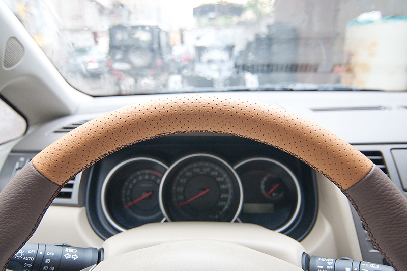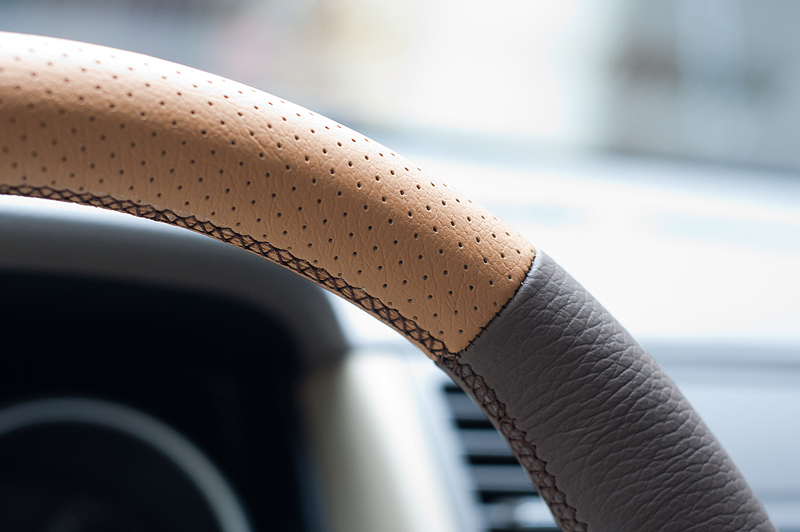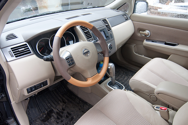 В Nissan Tiida был перешит руль. Были выбраны два типа кожи, обычная и перфорированая.