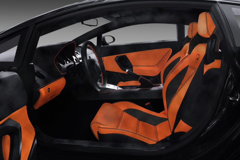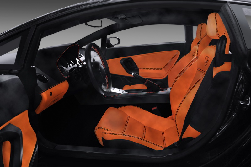 Интерьер: Задача дизайнера - предложить 2 варианта салона с небольшими изменениями. Основные пожелания: салон полностью должен быть перетянут в оранжевую и черную алькантару с контрастной строчкой. Вышивка на сиденьях - логотип Lamborghini.