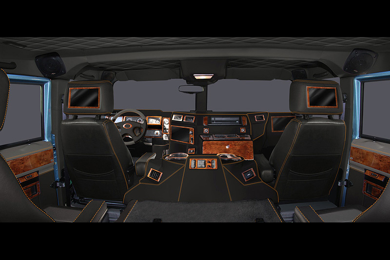 Была поставленна не простая задача - сделать комфортный автомобиль. Точнее сделать максимально комфортный салон. Перешив сидений, ковры, полное музыкальное оформление, мониторы, деревянные вставки. Двойная шумоизоляция. Все что нужно, чтобы человек чувствовал что он находится не в армейском вездеходе.