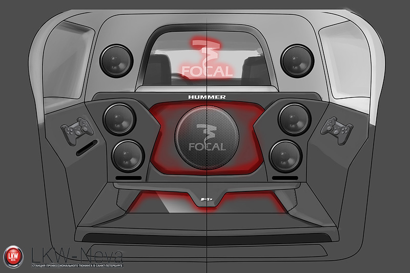 На эскизах вы можете видеть предложенные варианты и схемы расположения элементов мультимедиа в багажнике и на крышке багажника. Хотя в последствии вся схема была переиграна заново из-за желания клиента установить монитор еще большего размера.